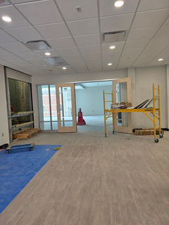 Lighting is being installed, flooring has been installed in the new reception area, stairs are being poured and painting has been finished in the commons