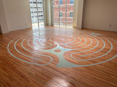 The reclaimed red oak flooring from the former chapel has been installed with some new red oak. The triune labyrinth is painted. More glossy coats of polyurethane will go one next week. We are excited that soon we walk it together in meditation and prayer.